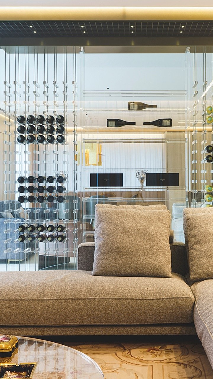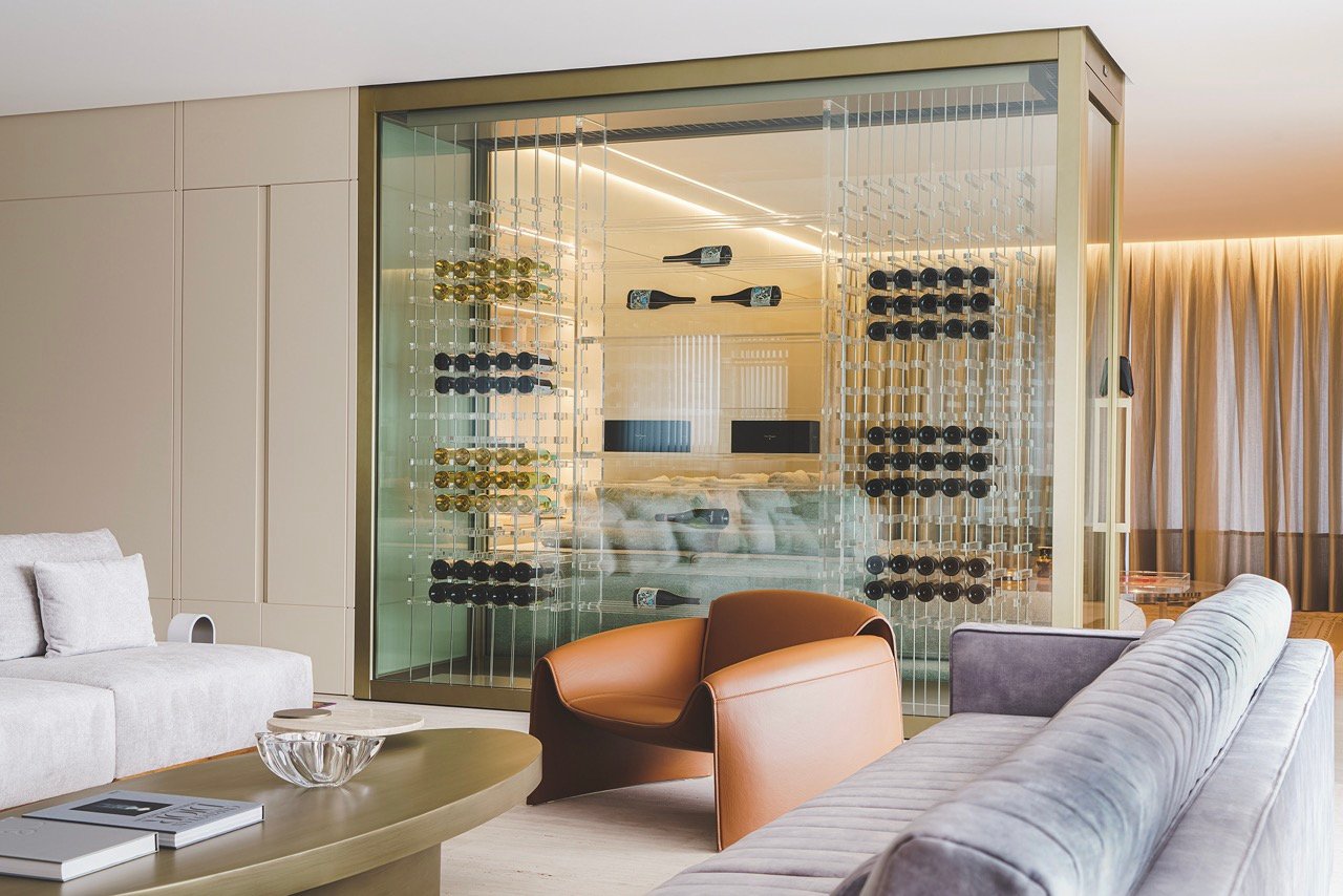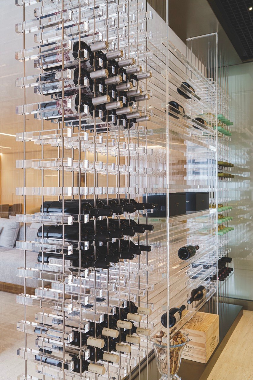 Uma caixa de vidro refinada onde o vinho flutua. Em parceria com Jayme Bernardo, este projeto subverte o tradicional ao utilizar o acrílico como elemento estrutural. Dos casulos frontais às prateleiras laterais, a transparência absoluta cria uma experiência visual onde a arquitetura desaparece para que o rótulo seja a única obra de arte.