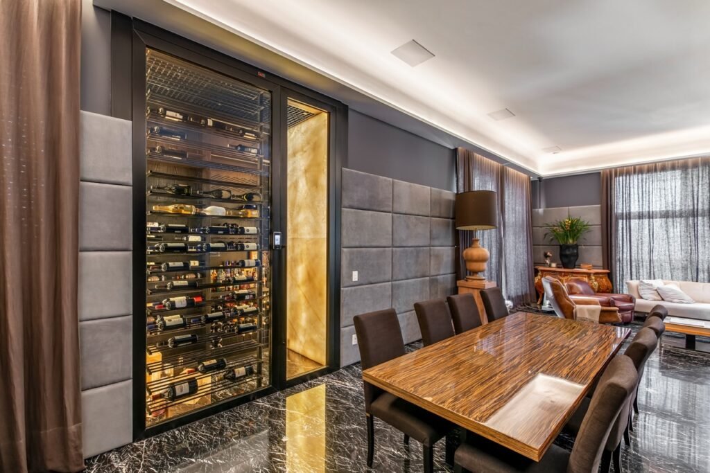 A tendência da arquitetura contemporânea é transformar a adega em uma “vitrine”, integrando-a ao Living ou à Sala de Jantar. No entanto, a luz é um agente agressivo. A radiação Ultravioleta (UV) causa uma reação fotoquímica no vinho conhecida como goût de lumière (gosto de luz), que traz notas desagradáveis de papelão molhado ou lã úmida à bebida.