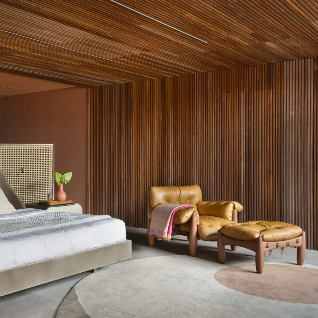 - Painéis ripados e volumetrias discretas