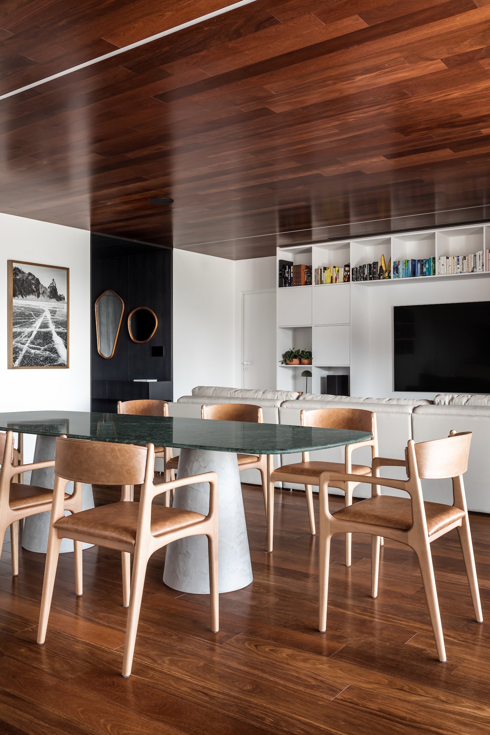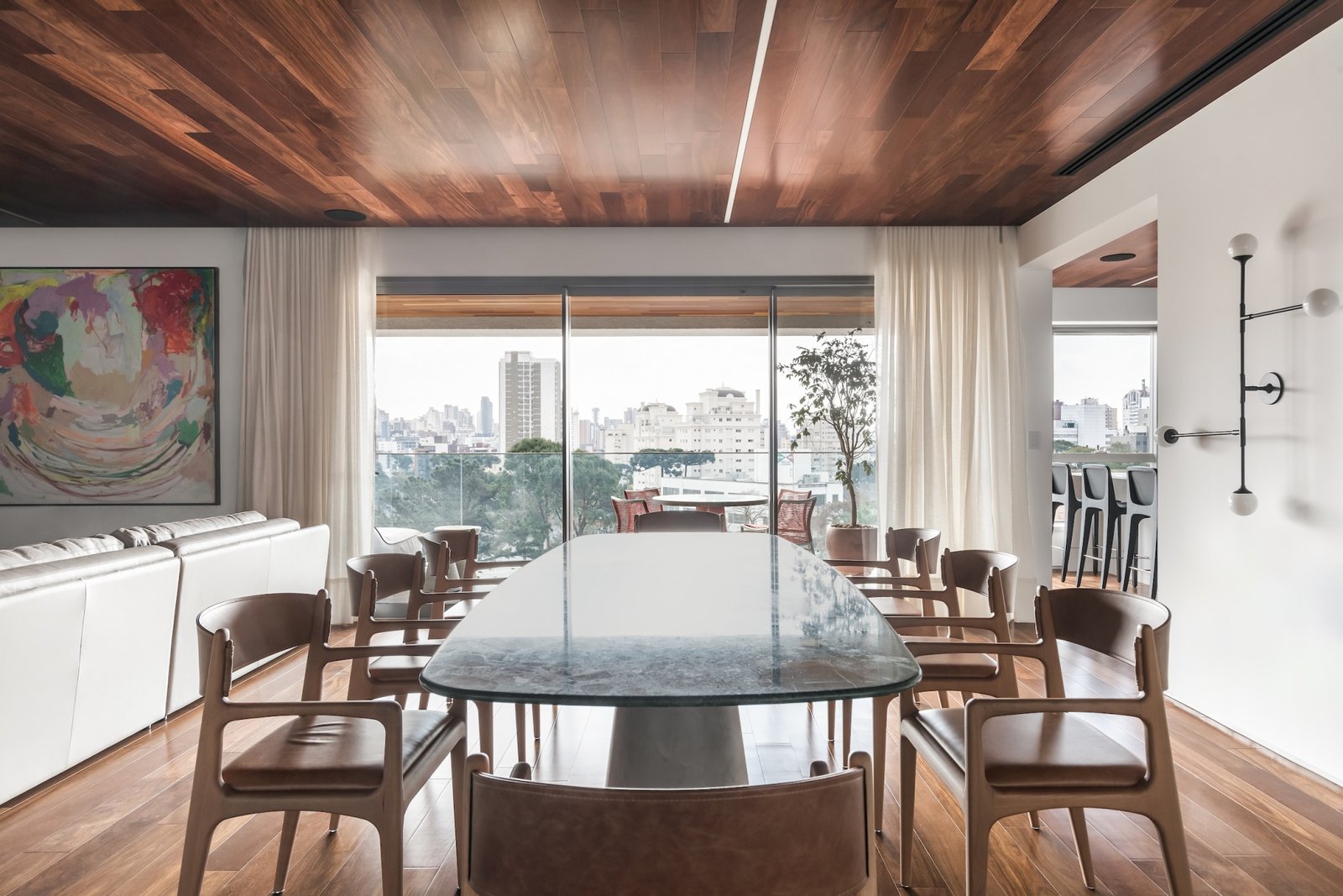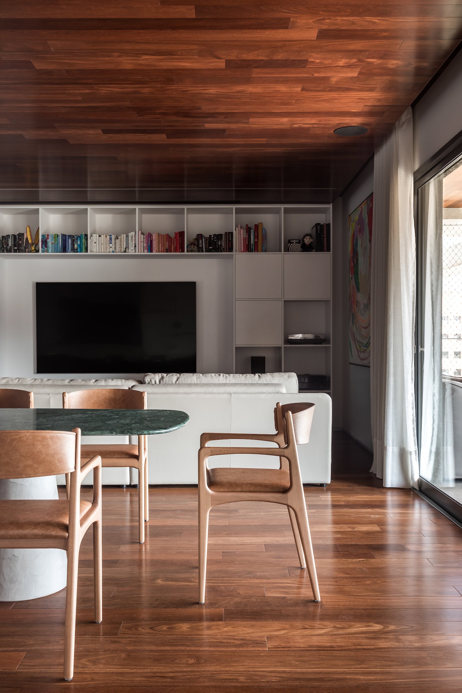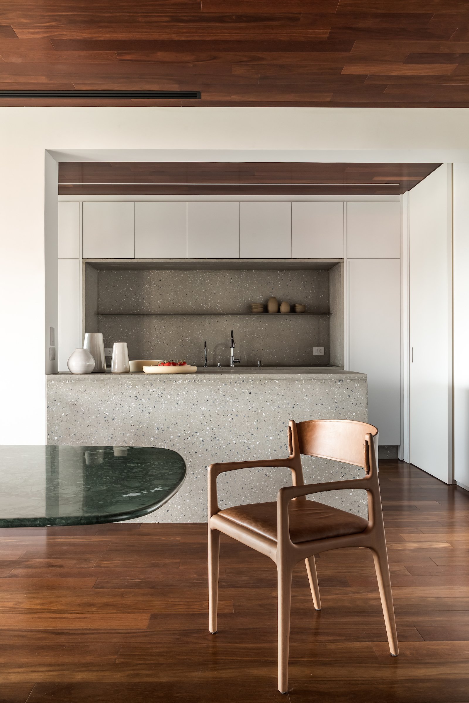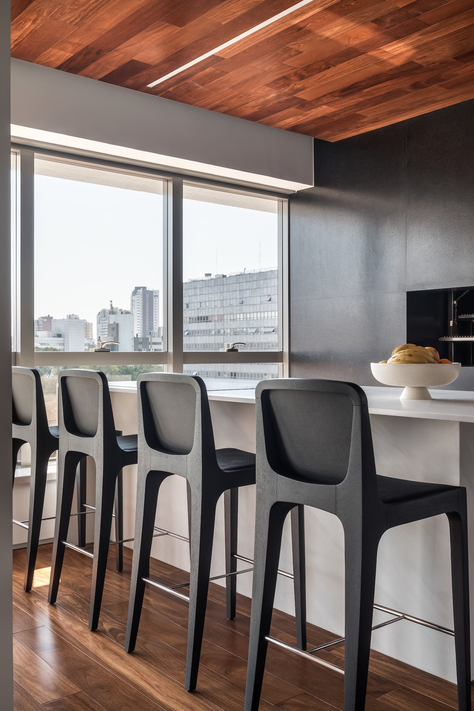 Em 257m² no coração de Curitiba, a Boscardin Corsi construiu uma linguagem onde os planos de madeira natural Sucupira no piso e no teto ditam o tom — e tudo o mais responde a essa escolha. O mobiliário neutro sob medida existe para não disputar. Os materiais de tampo trazem a surpresa que o projeto precisa — mármore verde Guatemala, granilite cinza, granito preto São Gabriel e mármore branco Sivek, cada um escolhido pelo toque tanto quanto pela cor. As portas em vidro fosco da Cinex com caixilho metálico percorrem o apartamento inteiro com coerência. A curadoria do mobiliário solto fecha o projeto com designers brasileiros — Jader Almeida, Estudiobola e Roberta Banquieri.