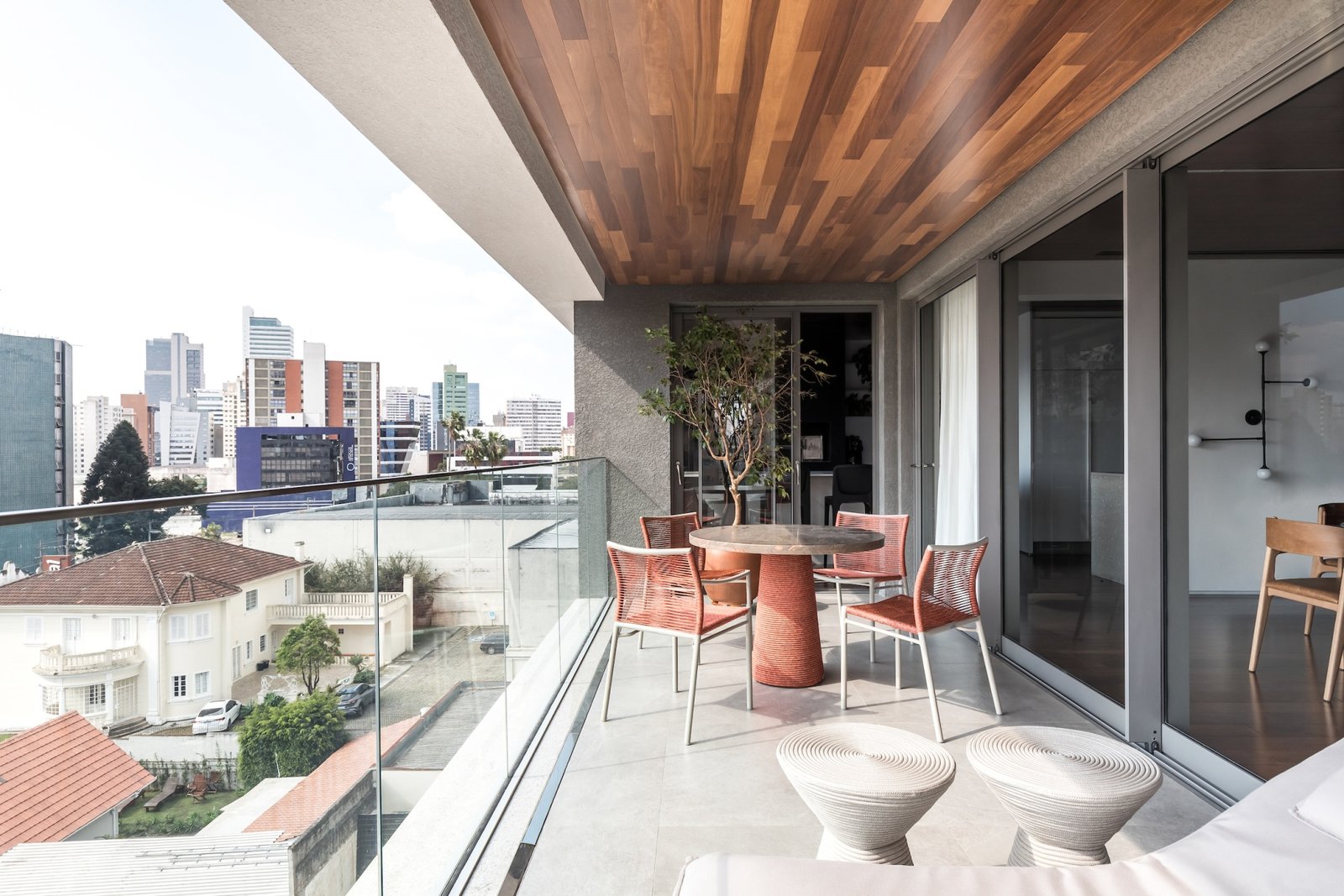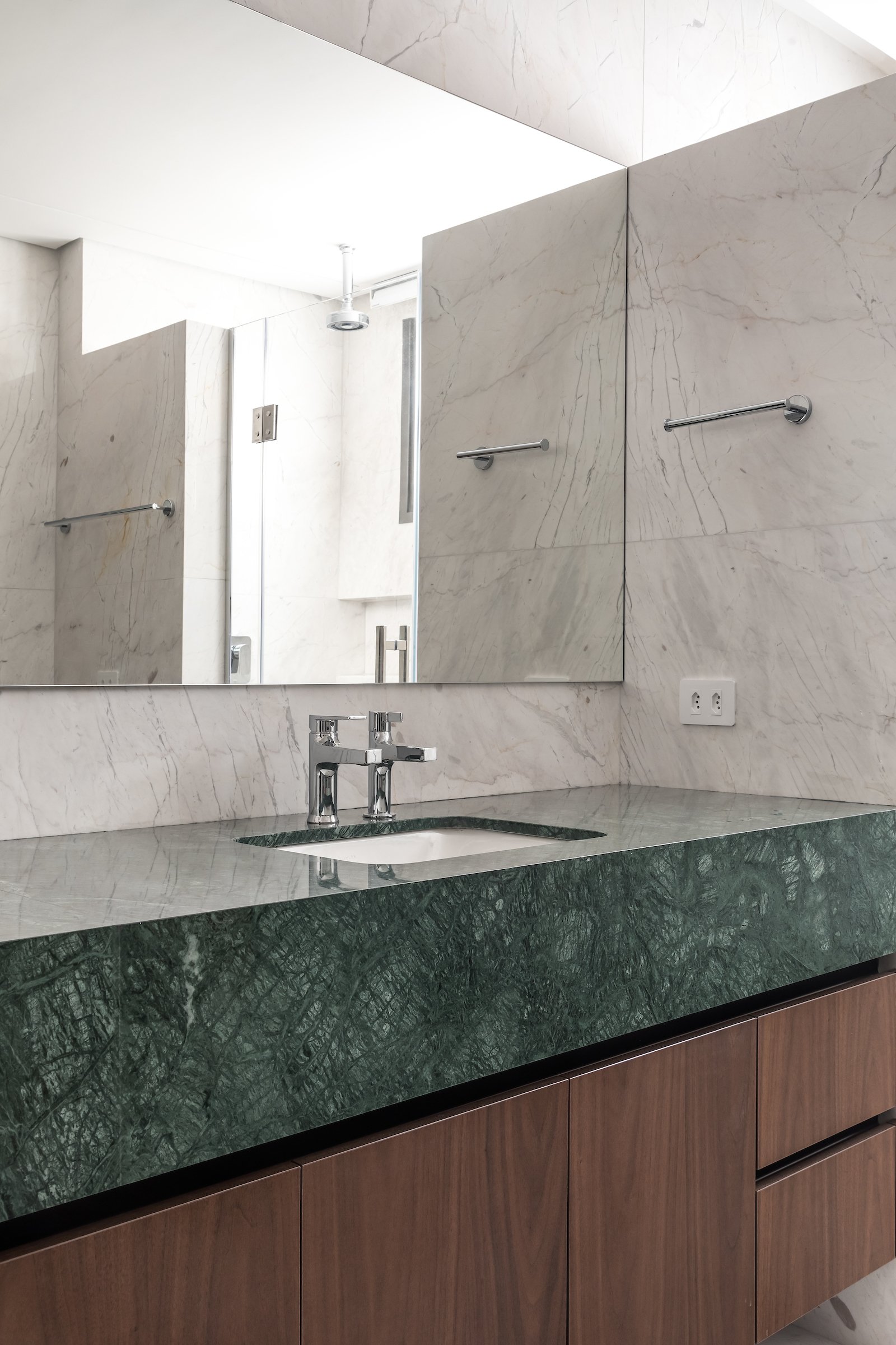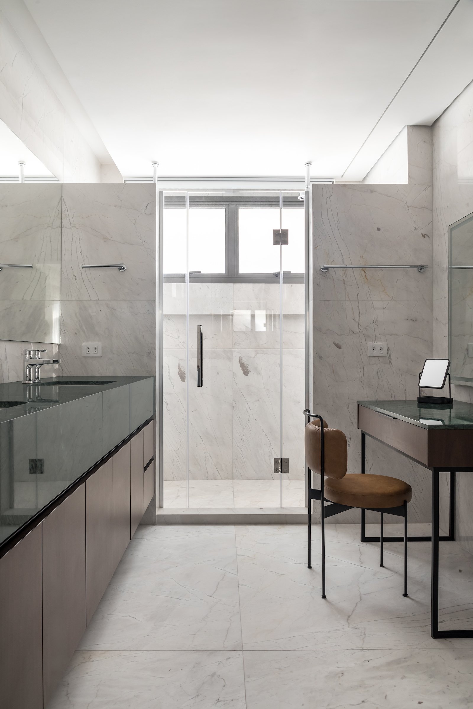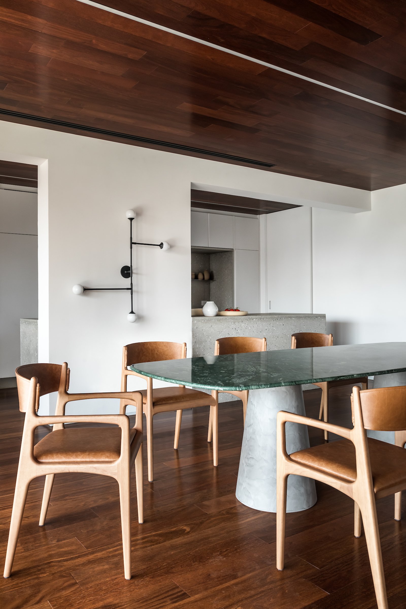 Em 257m² no coração de Curitiba, a Boscardin Corsi construiu uma linguagem onde os planos de madeira natural Sucupira no piso e no teto ditam o tom — e tudo o mais responde a essa escolha. O mobiliário neutro sob medida existe para não disputar. Os materiais de tampo trazem a surpresa que o projeto precisa — mármore verde Guatemala, granilite cinza, granito preto São Gabriel e mármore branco Sivek, cada um escolhido pelo toque tanto quanto pela cor. As portas em vidro fosco da Cinex com caixilho metálico percorrem o apartamento inteiro com coerência. A curadoria do mobiliário solto fecha o projeto com designers brasileiros — Jader Almeida, Estudiobola e Roberta Banquieri.