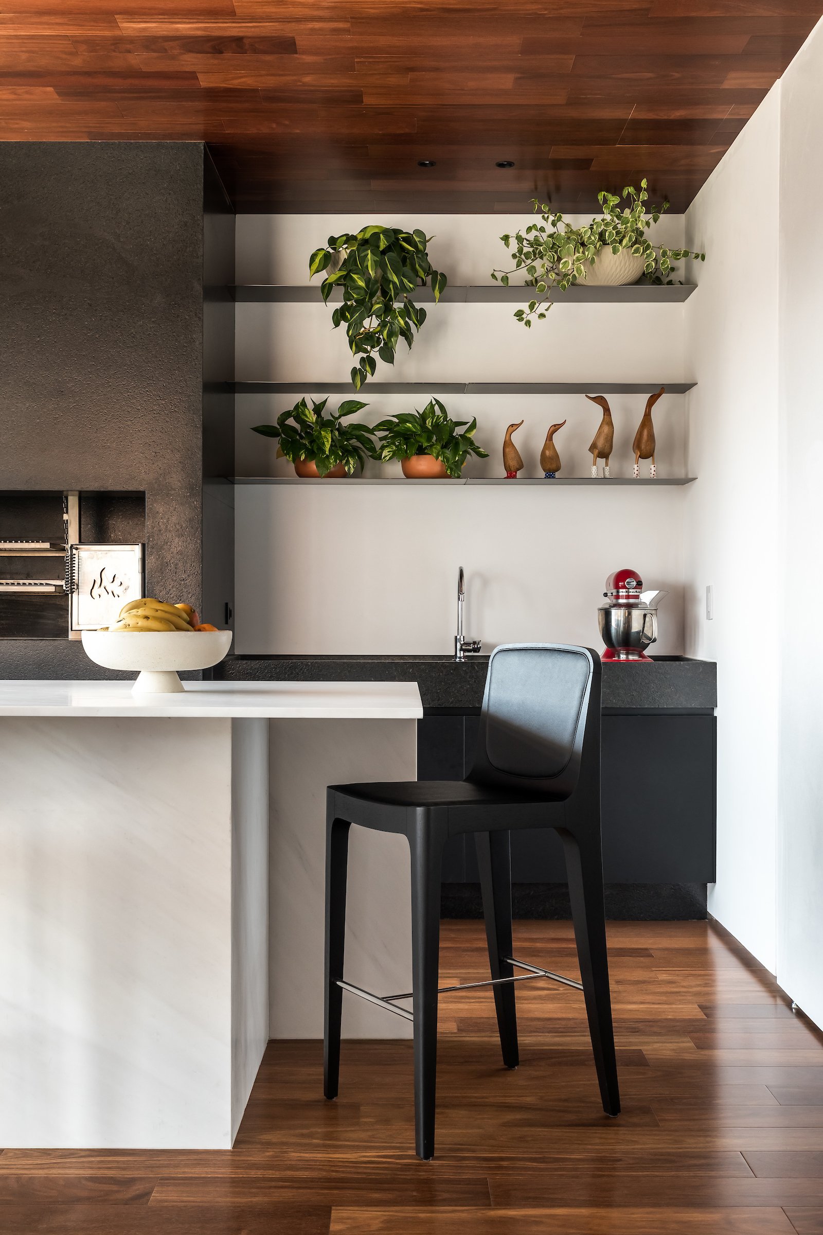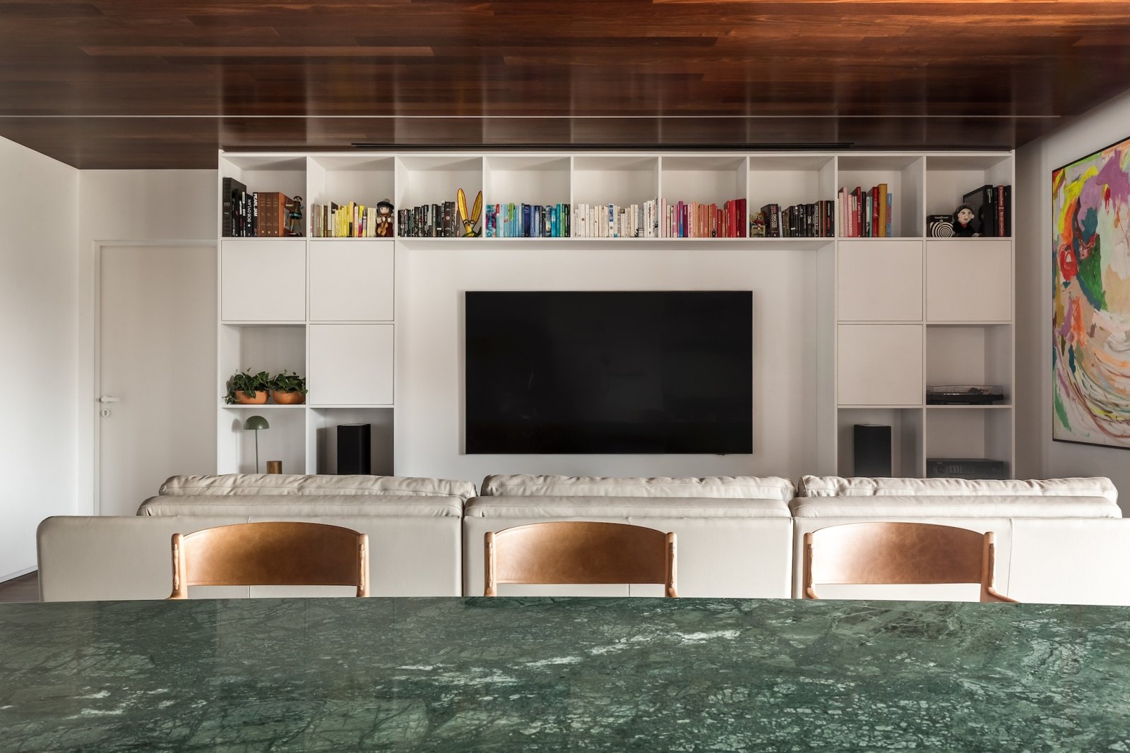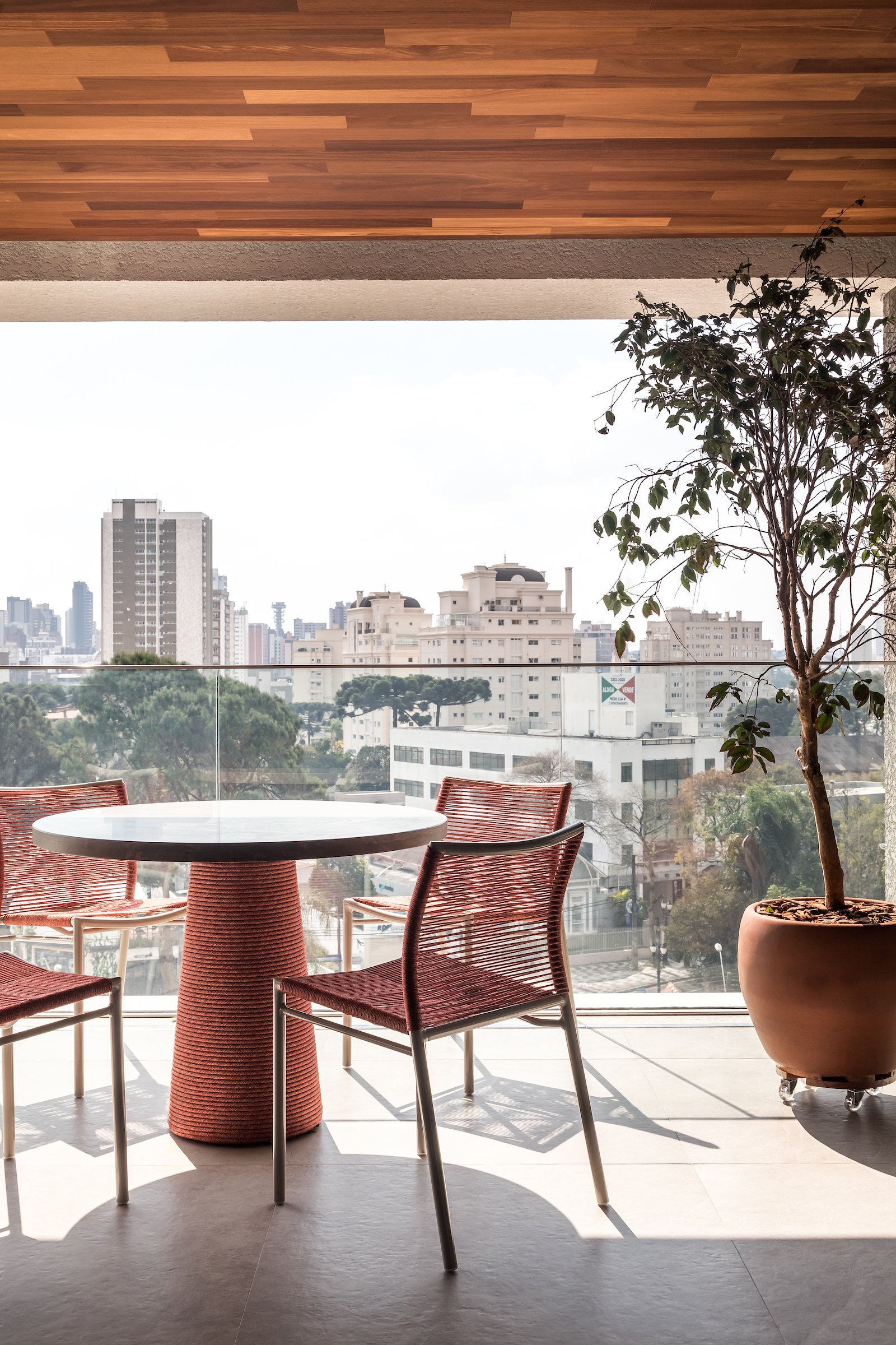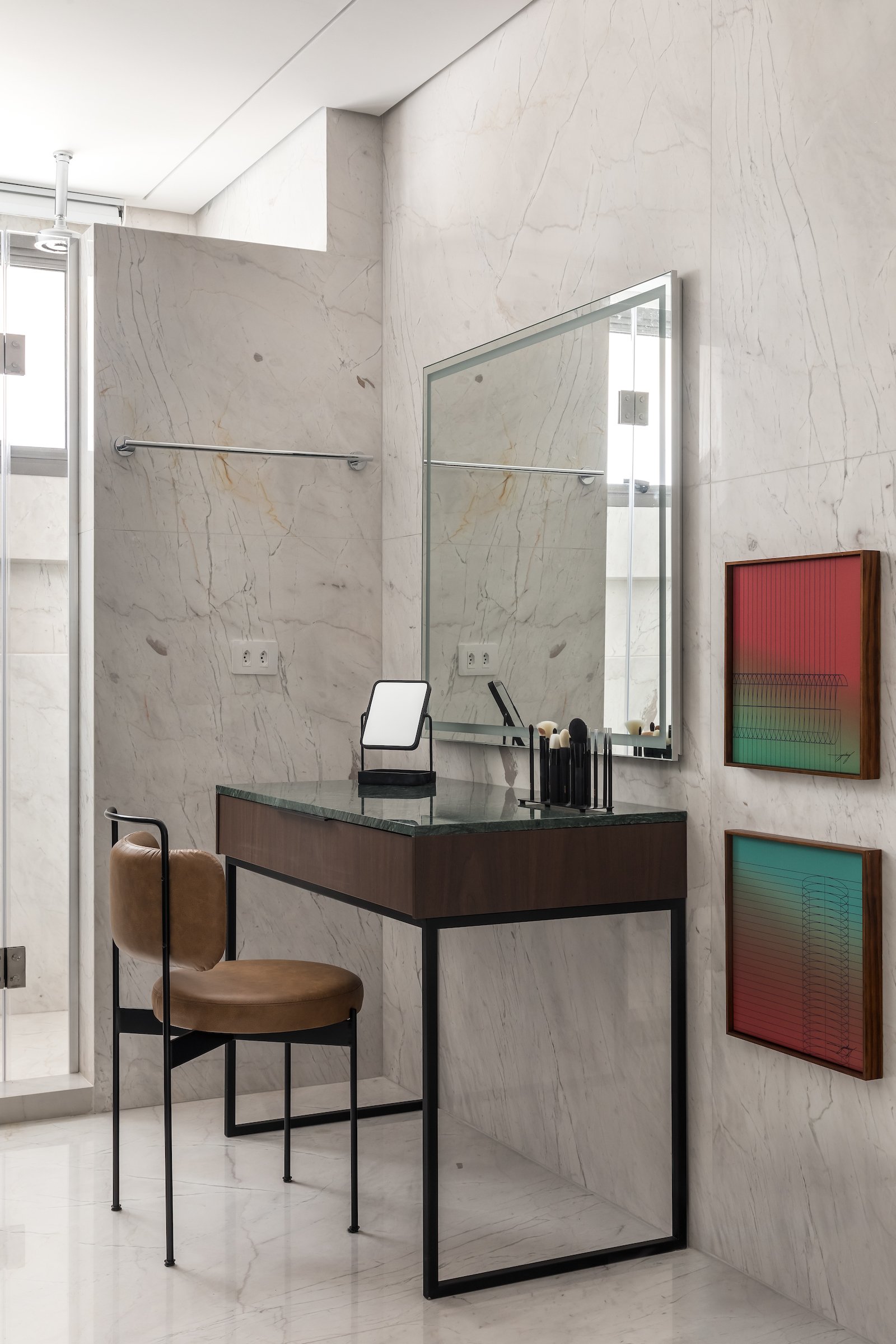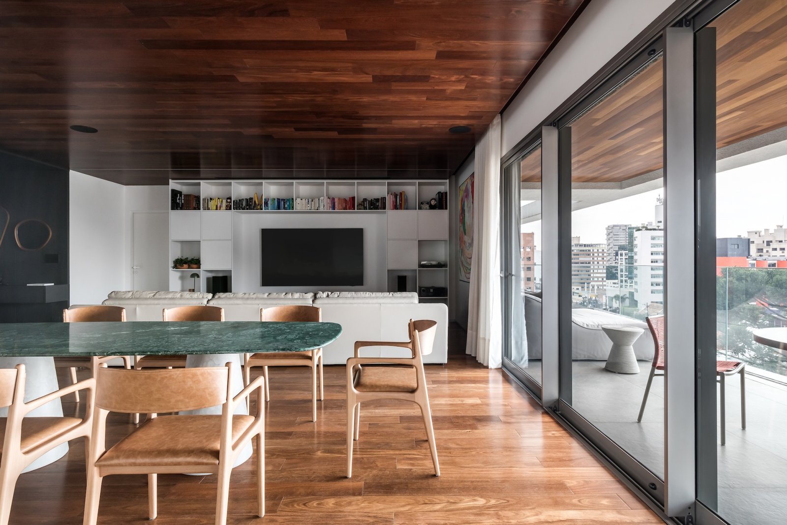 Em 257m² no coração de Curitiba, a Boscardin Corsi construiu uma linguagem onde os planos de madeira natural Sucupira no piso e no teto ditam o tom — e tudo o mais responde a essa escolha. O mobiliário neutro sob medida existe para não disputar. Os materiais de tampo trazem a surpresa que o projeto precisa — mármore verde Guatemala, granilite cinza, granito preto São Gabriel e mármore branco Sivek, cada um escolhido pelo toque tanto quanto pela cor. As portas em vidro fosco da Cinex com caixilho metálico percorrem o apartamento inteiro com coerência. A curadoria do mobiliário solto fecha o projeto com designers brasileiros — Jader Almeida, Estudiobola e Roberta Banquieri.