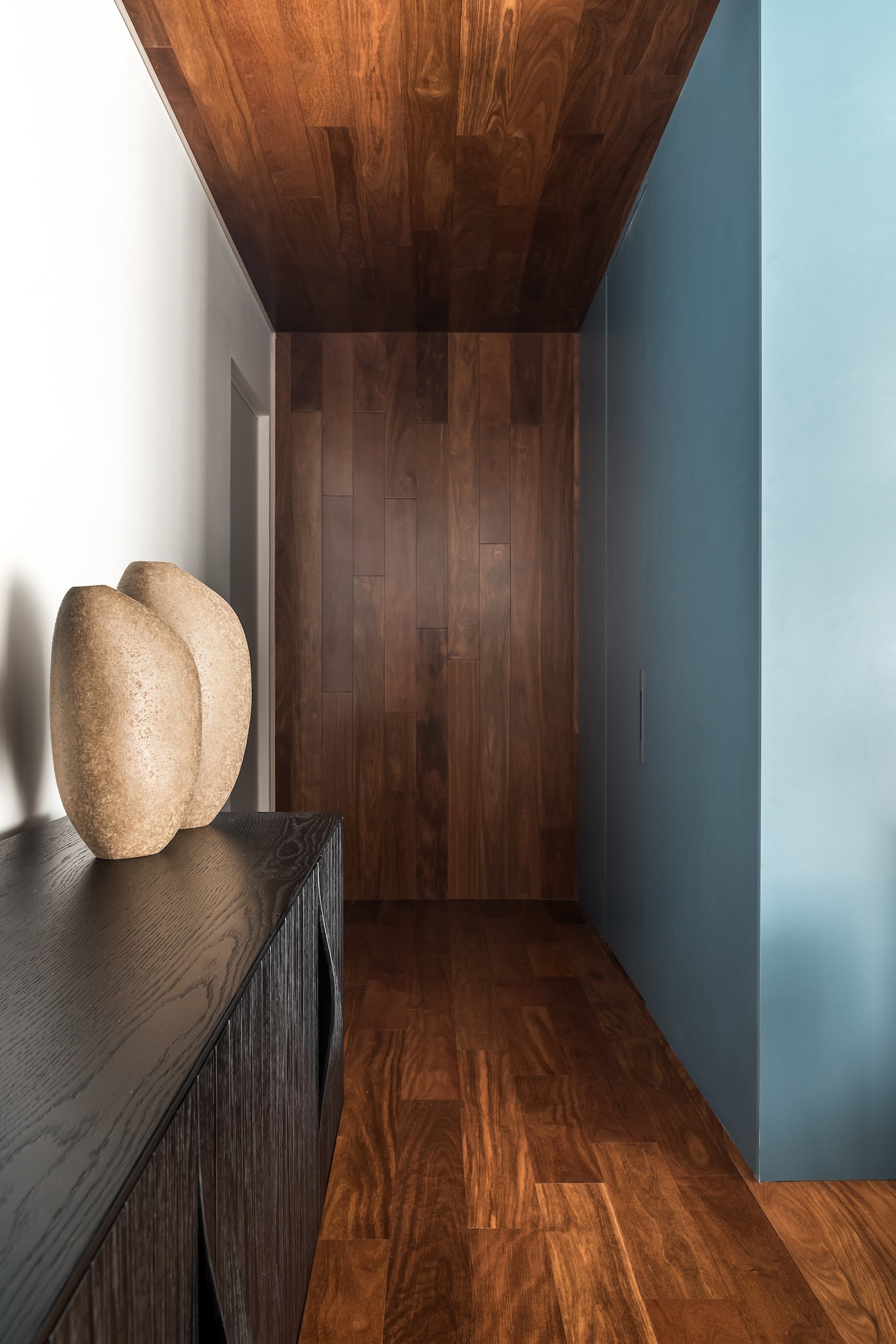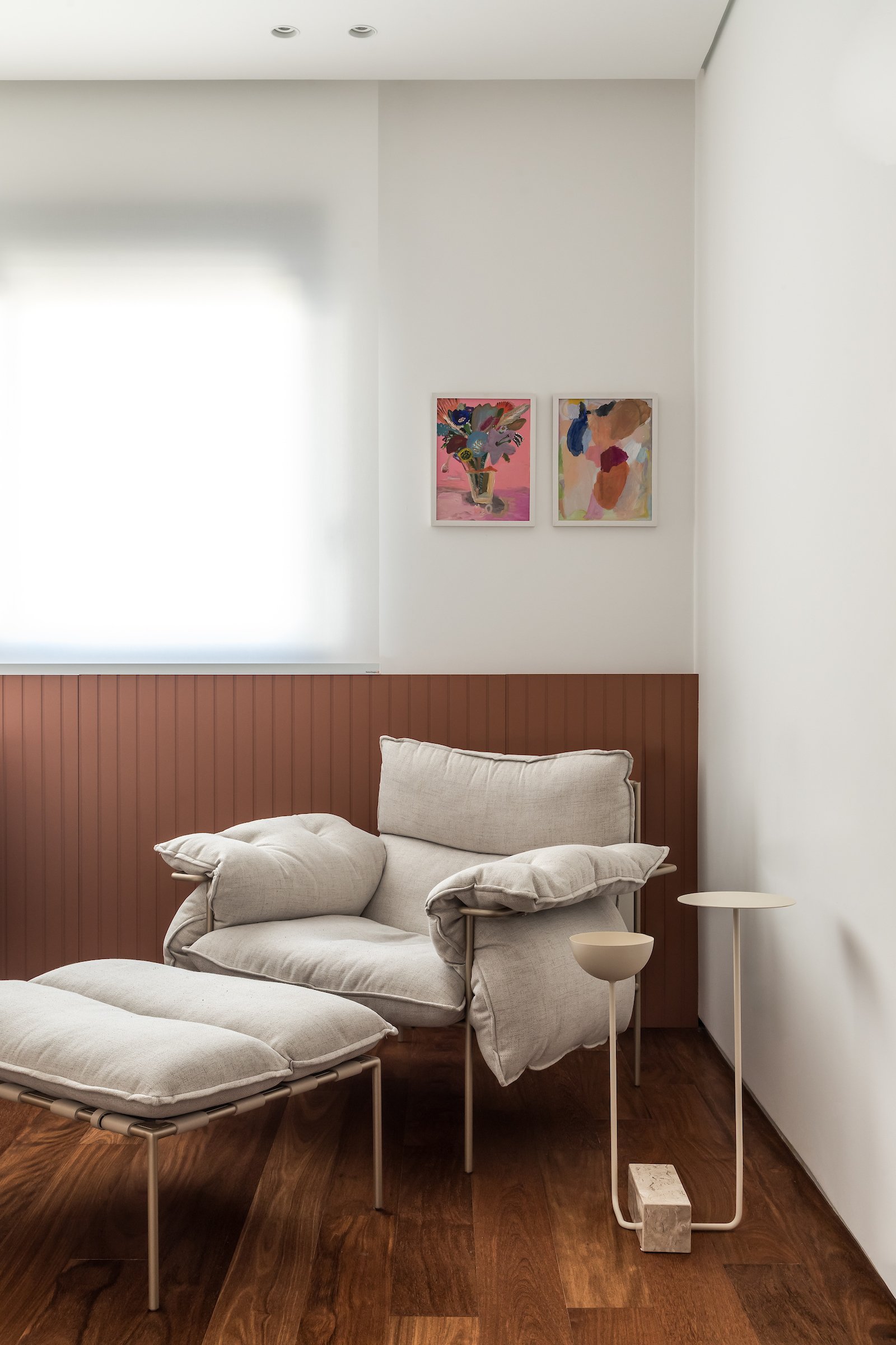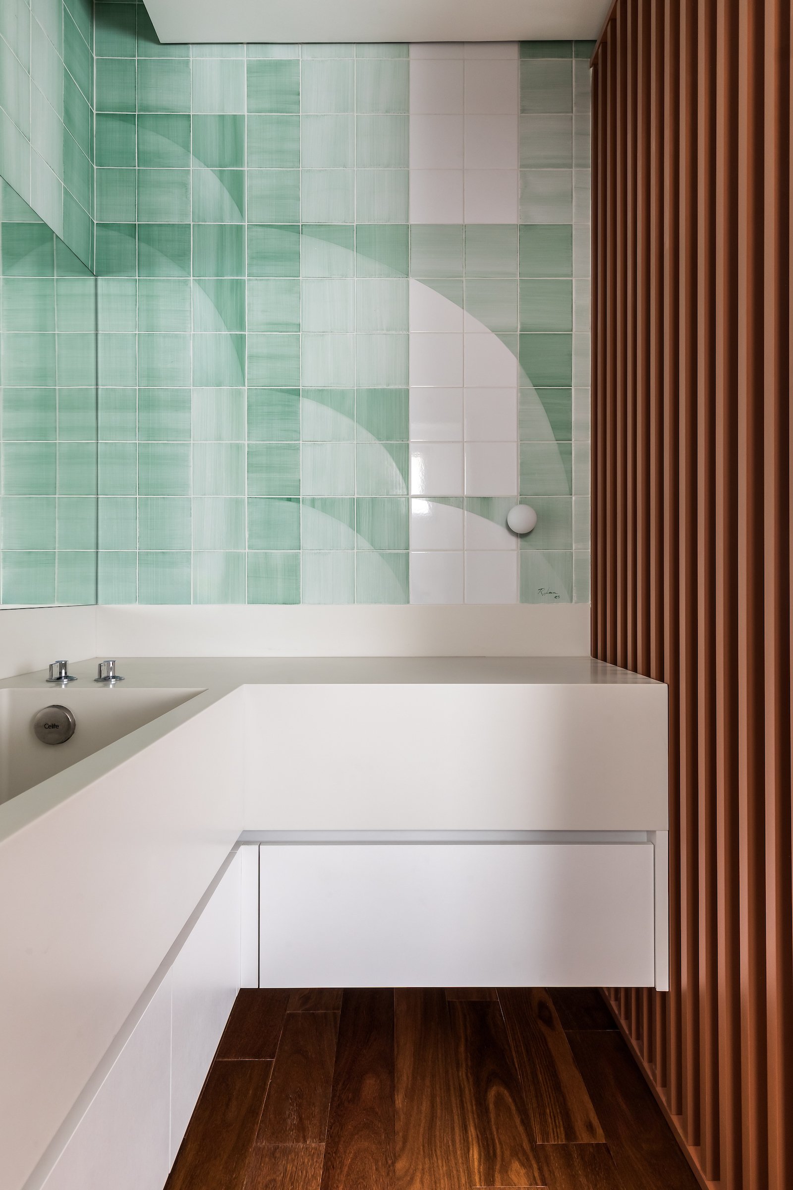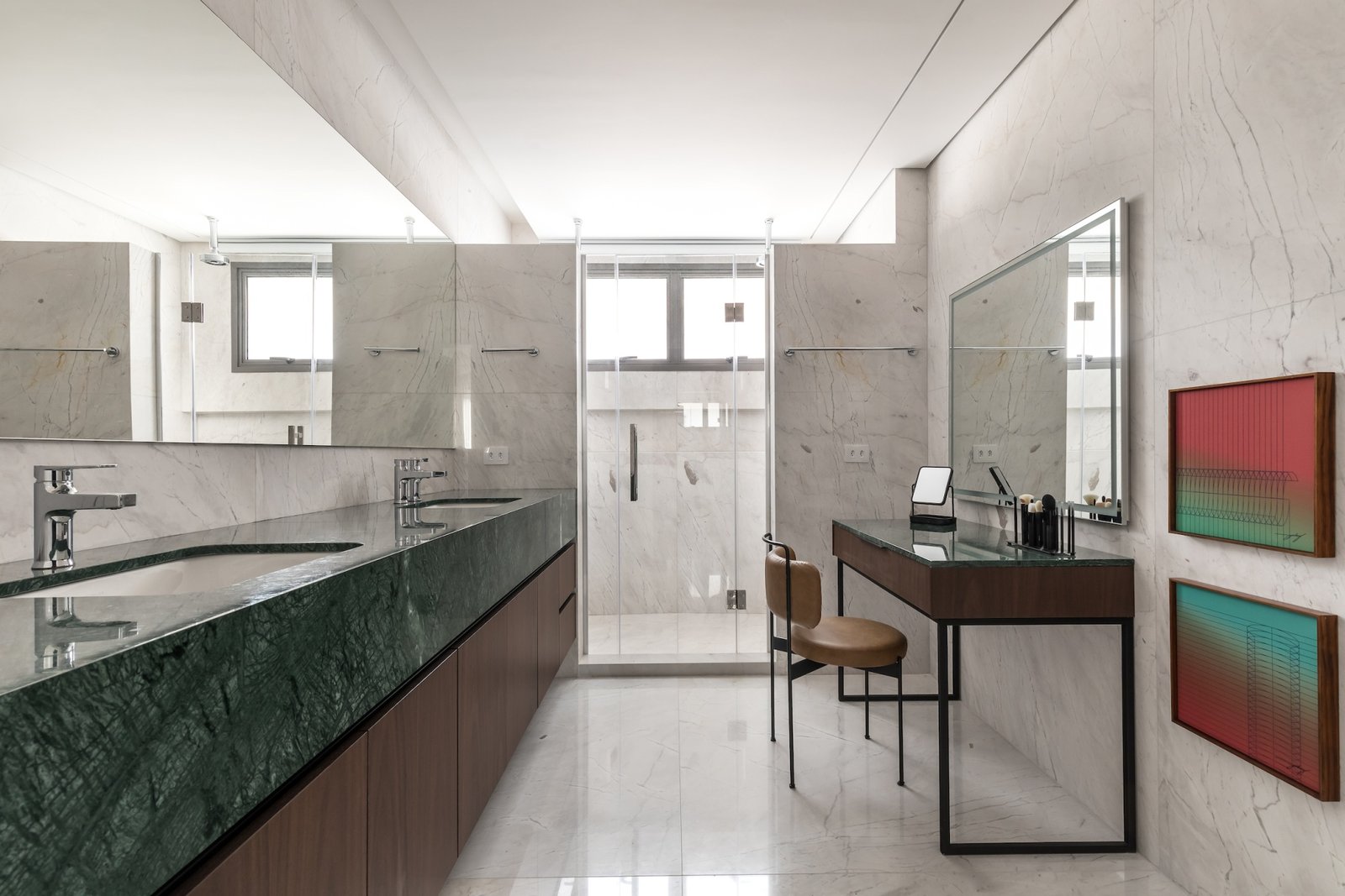 Em 257m² no coração de Curitiba, a Boscardin Corsi construiu uma linguagem onde os planos de madeira natural Sucupira no piso e no teto ditam o tom — e tudo o mais responde a essa escolha. O mobiliário neutro sob medida existe para não disputar. Os materiais de tampo trazem a surpresa que o projeto precisa — mármore verde Guatemala, granilite cinza, granito preto São Gabriel e mármore branco Sivek, cada um escolhido pelo toque tanto quanto pela cor. As portas em vidro fosco da Cinex com caixilho metálico percorrem o apartamento inteiro com coerência. A curadoria do mobiliário solto fecha o projeto com designers brasileiros — Jader Almeida, Estudiobola e Roberta Banquieri.