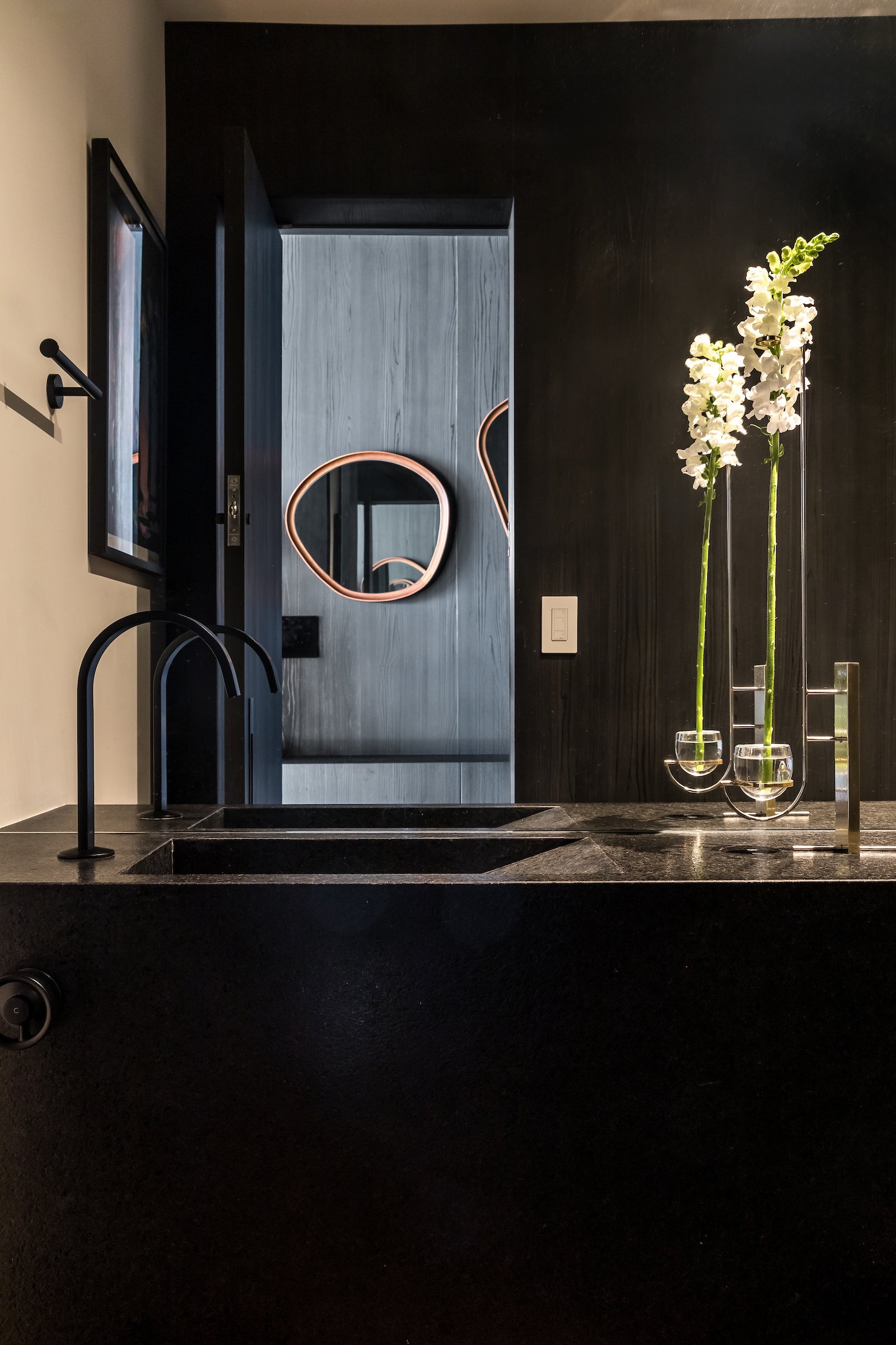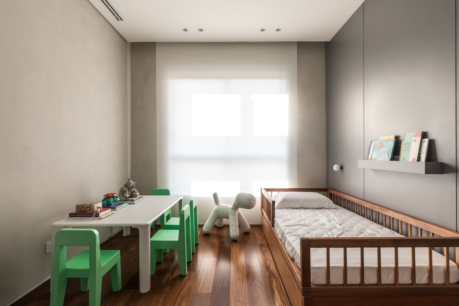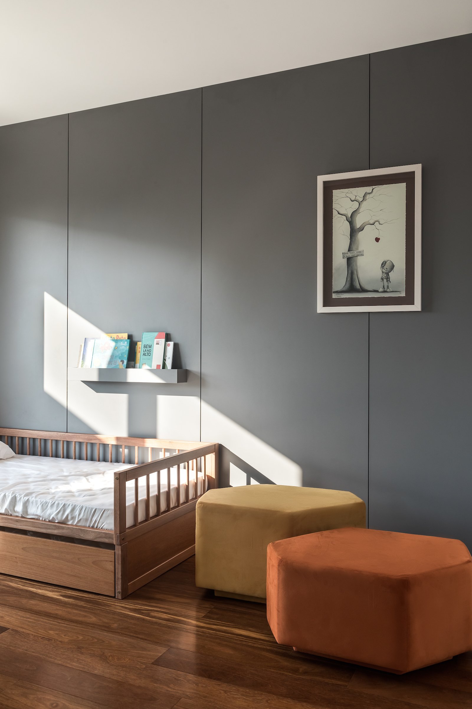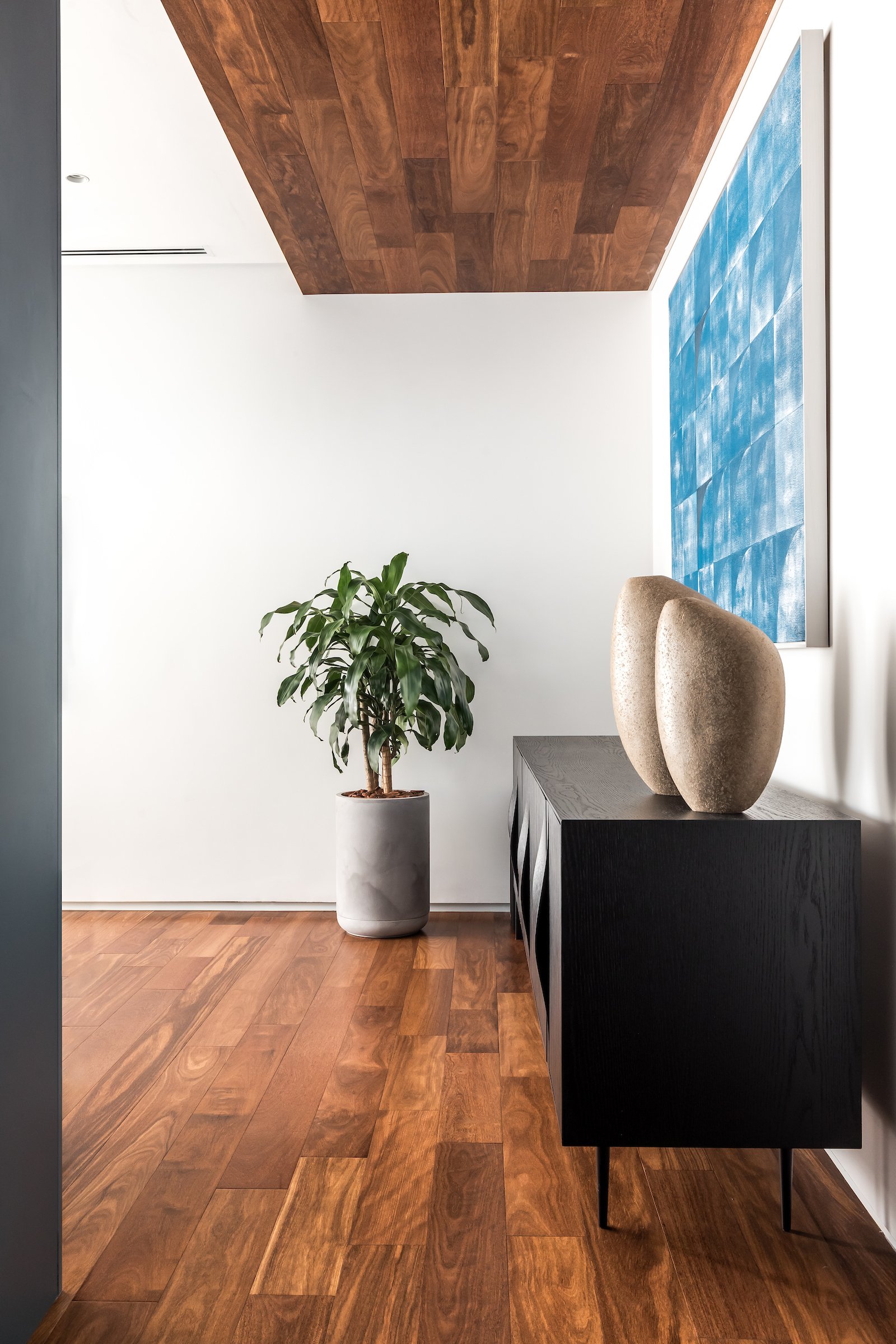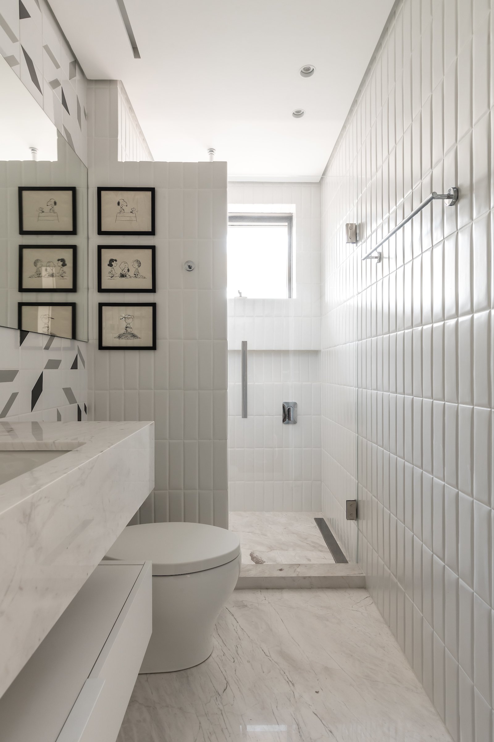 Em 257m² no coração de Curitiba, a Boscardin Corsi construiu uma linguagem onde os planos de madeira natural Sucupira no piso e no teto ditam o tom — e tudo o mais responde a essa escolha. O mobiliário neutro sob medida existe para não disputar. Os materiais de tampo trazem a surpresa que o projeto precisa — mármore verde Guatemala, granilite cinza, granito preto São Gabriel e mármore branco Sivek, cada um escolhido pelo toque tanto quanto pela cor. As portas em vidro fosco da Cinex com caixilho metálico percorrem o apartamento inteiro com coerência. A curadoria do mobiliário solto fecha o projeto com designers brasileiros — Jader Almeida, Estudiobola e Roberta Banquieri.