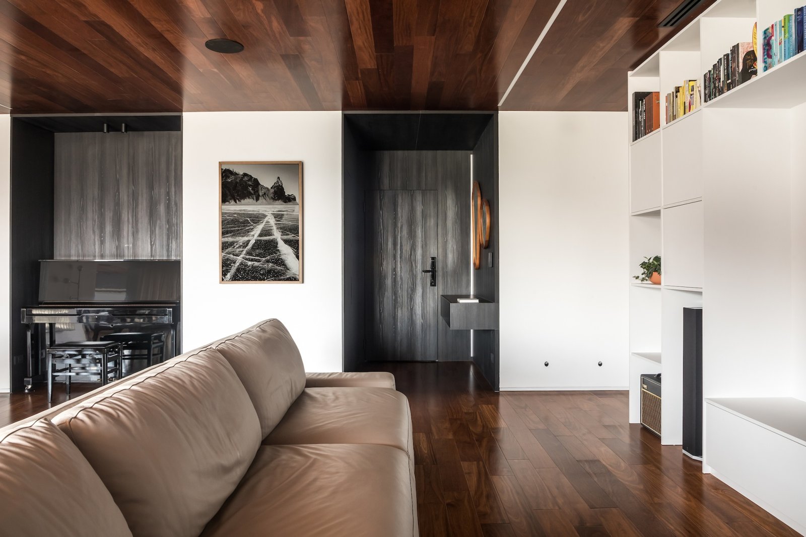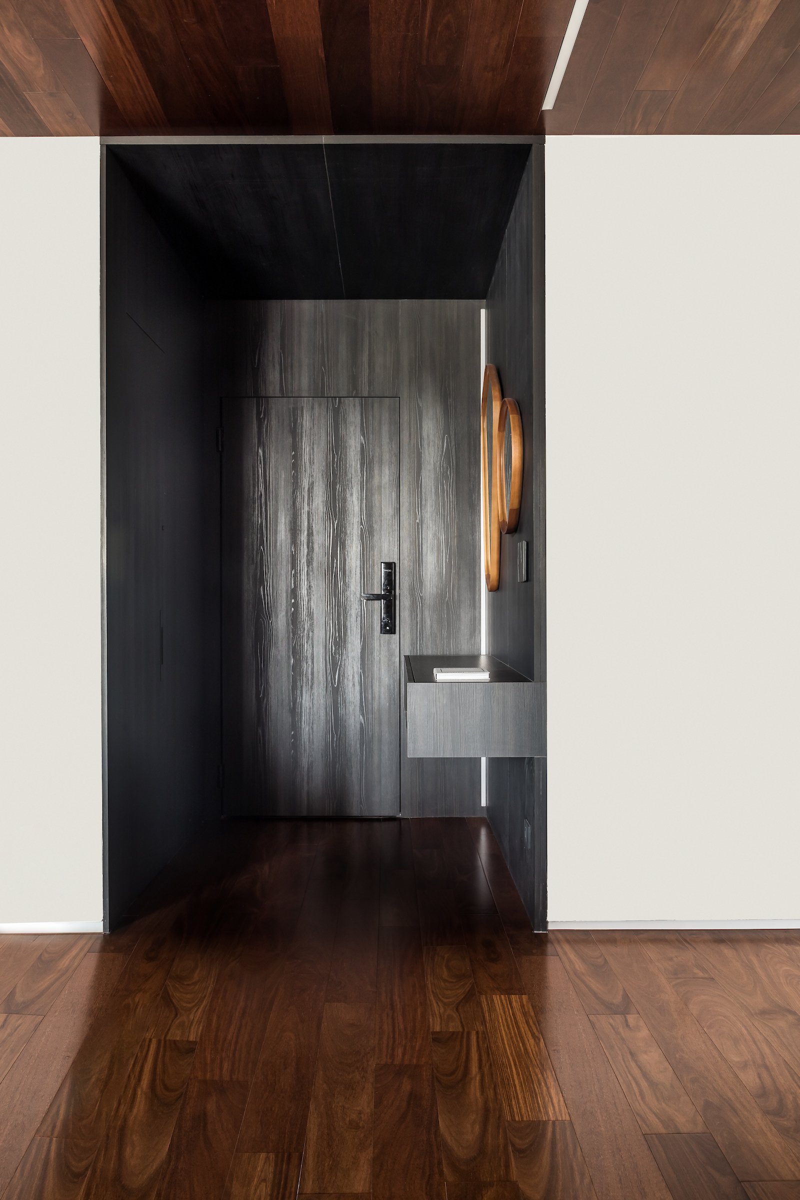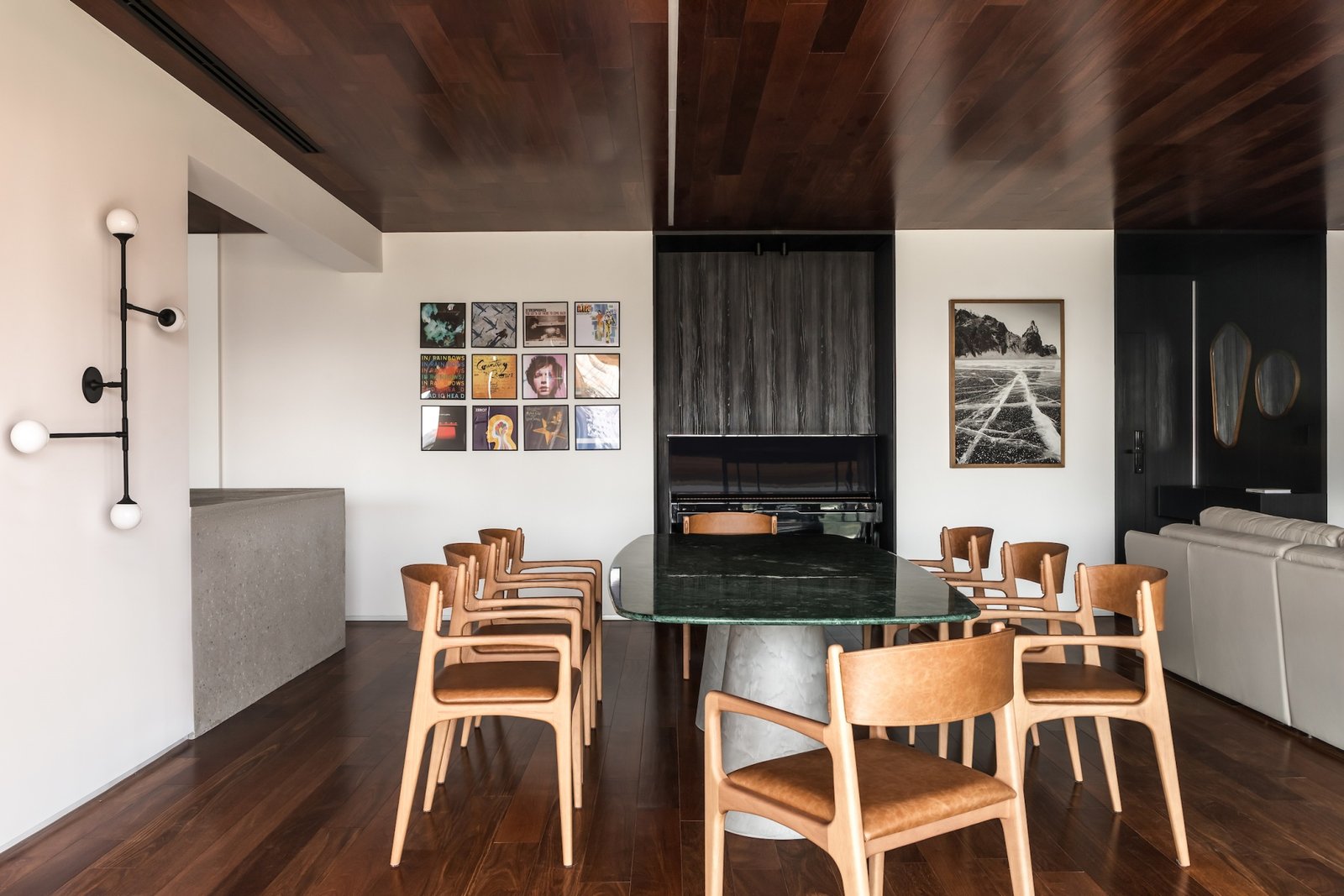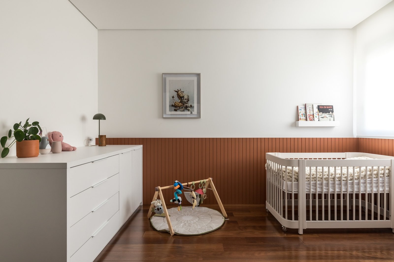 Em 257m² no coração de Curitiba, a Boscardin Corsi construiu uma linguagem onde os planos de madeira natural Sucupira no piso e no teto ditam o tom — e tudo o mais responde a essa escolha. O mobiliário neutro sob medida existe para não disputar. Os materiais de tampo trazem a surpresa que o projeto precisa — mármore verde Guatemala, granilite cinza, granito preto São Gabriel e mármore branco Sivek, cada um escolhido pelo toque tanto quanto pela cor. As portas em vidro fosco da Cinex com caixilho metálico percorrem o apartamento inteiro com coerência. A curadoria do mobiliário solto fecha o projeto com designers brasileiros — Jader Almeida, Estudiobola e Roberta Banquieri.