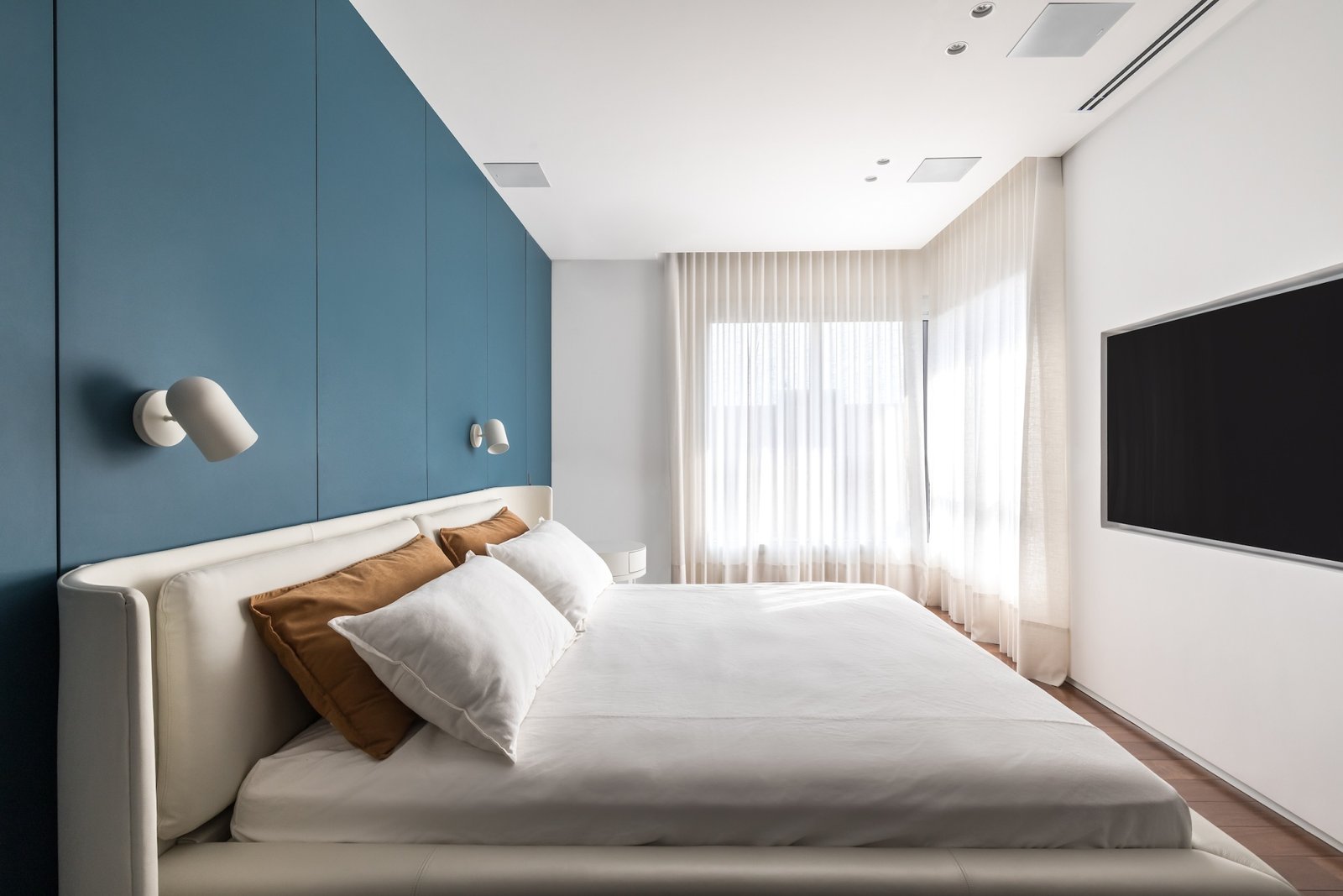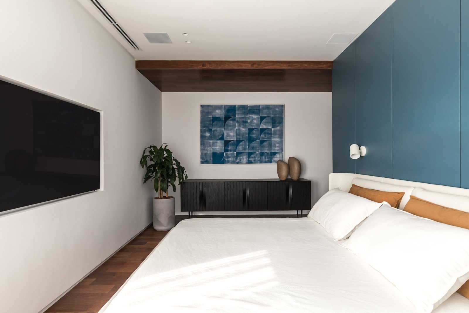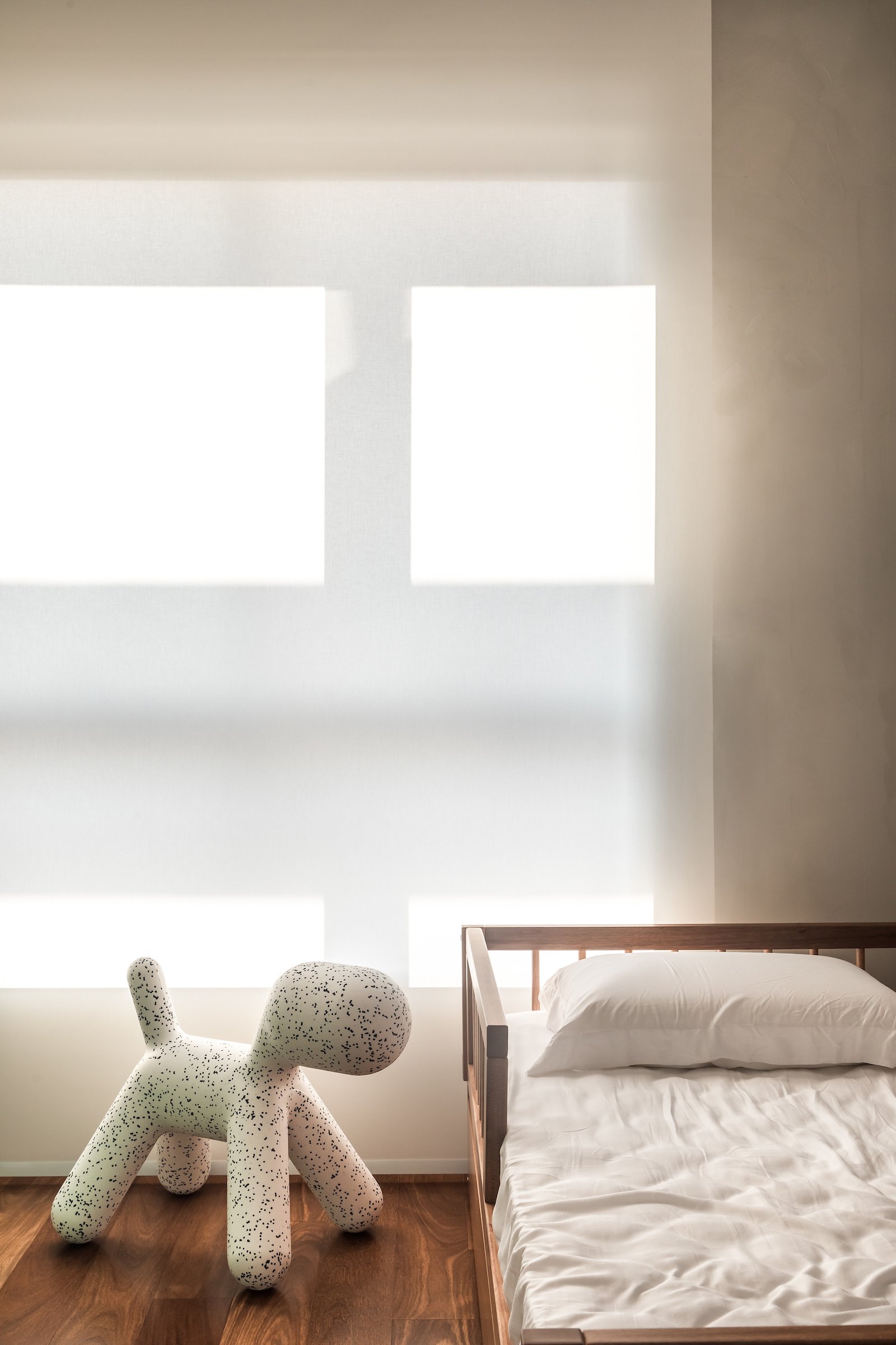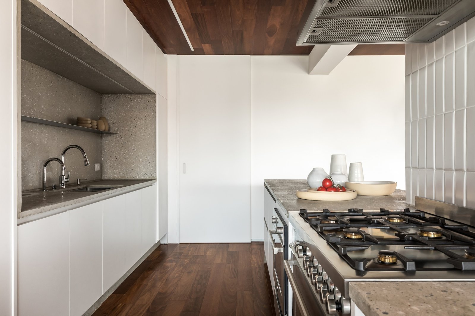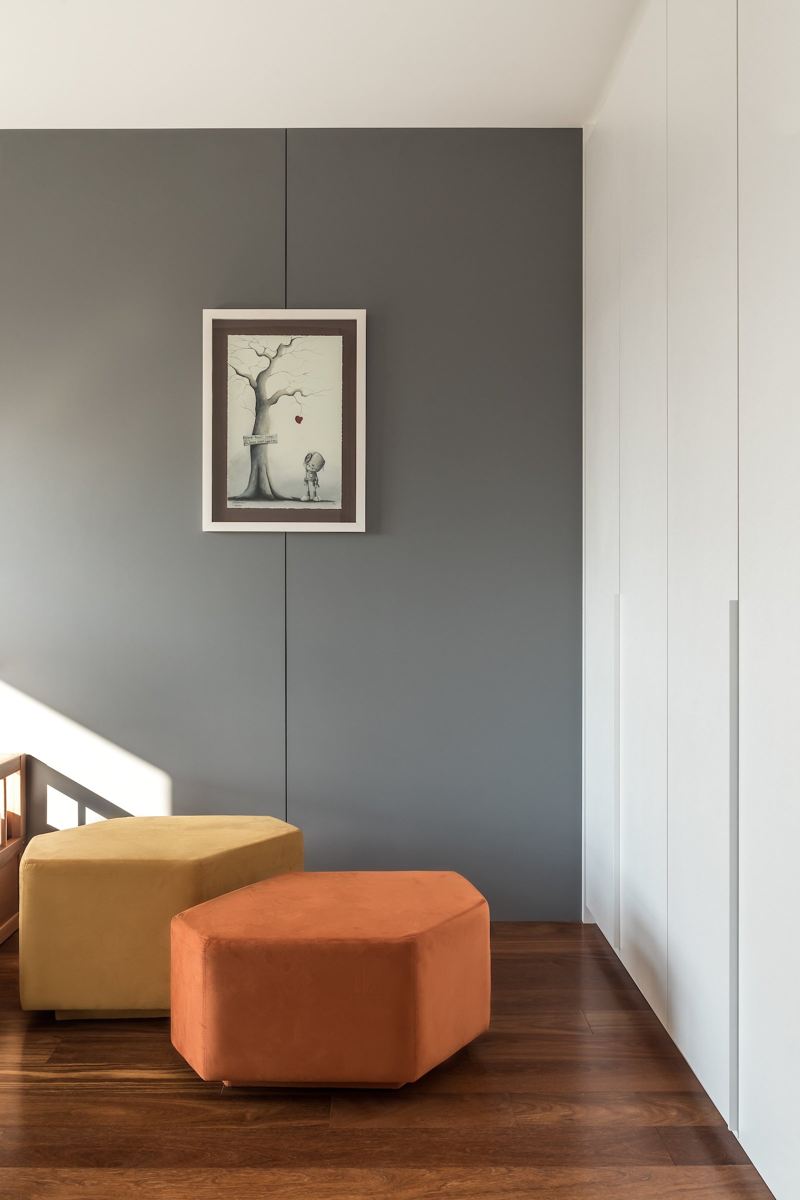 Em 257m² no coração de Curitiba, a Boscardin Corsi construiu uma linguagem onde os planos de madeira natural Sucupira no piso e no teto ditam o tom — e tudo o mais responde a essa escolha. O mobiliário neutro sob medida existe para não disputar. Os materiais de tampo trazem a surpresa que o projeto precisa — mármore verde Guatemala, granilite cinza, granito preto São Gabriel e mármore branco Sivek, cada um escolhido pelo toque tanto quanto pela cor. As portas em vidro fosco da Cinex com caixilho metálico percorrem o apartamento inteiro com coerência. A curadoria do mobiliário solto fecha o projeto com designers brasileiros — Jader Almeida, Estudiobola e Roberta Banquieri.